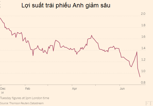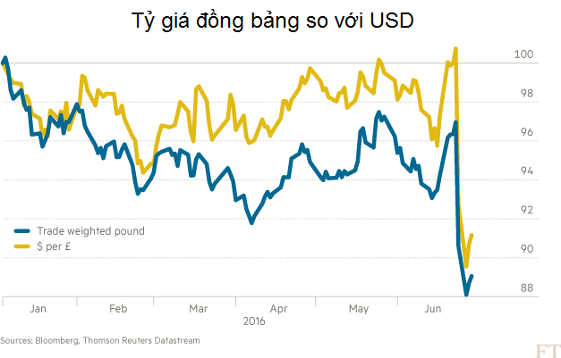 Cú sốc Brexit Ngay khi thị trường tạm thời ổn định trở lại sau khi bị càn quét bởi “cơn bão” đầu năm và các nhà đầu tư háo hức tìm kiếm cơ hội lao vào bắt đáy, sự chú ý lại đổ dồn về cuộc trưng cầu dân ý của người Anh. Vì trước đó ai cũng tự tin về một kết quả ngược lại, lựa chọn sẽ ra đi của người dân “xứ sở sương mù” thực sự là một cú sốc quá lớn đối với thị trường tài chính quốc tế. Trước thềm cuộc trưng cầu, Financial Times nhấn mạnh kết quả “Ra đi” sẽ khiến đồng bảng cùng với lợi suất trái phiếu Chính phủ giảm sâu, buộc NHTW Anh phải “hồi sinh” gói nới lỏng định lượng. Và đúng như vậy, bảng Anh đã lao dốc thẳng đứng trong khi lợi suất trái phiếu Anh kỳ hạn 10 năm rơi xuống dưới 1%.