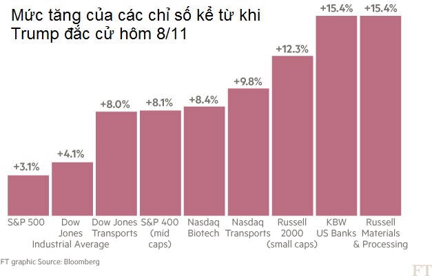 Rắc rối từ lợi suất trái phiếu ở mức siêu thấp Sự kiện Brexit và sau đó là động thái hồi sinh gói nới lỏng định lượng của NHTW Anh là những lực đẩy khiến các loại trái phiếu tăng giá mạnh mẽ, củng cố một trong những xu hướng rõ nét của năm 2016. Đến tháng 8, lợi suất trái phiếu toàn cầu ở mức thấp nhất từ trước đến nay. Lợi suất trái phiếu Anh giảm xuống còn 0,51%, trong khi toàn bộ các loại trái phiếu do Chính phủ Thụy Sĩ phát hành được giao dịch với mức lợi suất âm. Tính đến tháng 8, quy mô thị trường trái phiếu có lợi suất âm đã lên đến 13.400 tỷ USD. “Nạn nhân” của hiện tượng này chính là các quỹ hưu trí và ngành bảo hiểm. Nhiều nước đứng trước nguy cơ vỡ quỹ vì gánh nặng chi trả ngày càng lớn (do dân số già hóa) trong khi lợi nhuận thu được từ các khoản đầu tư ngày càng teo tóp. Hiệu ứng Trump thổi bay mọi sự lo lắng của thị trường Sau cú sốc Brexit, nhà đầu tư đón nhận cuộc bầu cử Tổng thống Mỹ với tâm lý không hề thoải mái. Dòng tiền thông minh đã chọn cựu Ngoại trưởng Hillary Clinton. Chiến thắng bất ngờ của Donald Trump thực sự là một cú sốc, nhưng lần này cú sốc ấy nhanh chóng biến mất chỉ trong vài tiếng đồng hồ ngắn ngủi. Nhà đầu tư được xoa dịu bởi viễn cảnh Quốc hội Mỹ dưới quyền kiểm soát của đảng Cộng hòa sẽ tung ra nhiều gói kích thích tài khóa, mạnh tay cắt giảm thuế và thu hồi nhiều luật lệ đang kìm hãm hoạt động kinh doanh của doanh nghiệp. Ngay lập tức, trong mắt nhà đầu tư hiện ra viễn cảnh chính sách tài khóa mới sẽ giúp nền kinh tế lớn nhất thế giới bùng nổ và nuôi dưỡng lạm phát. Chỉ trong nháy mắt thị trường trái phiếu đã đảo chiều. Ở phố Wall, một bữa đại tiệc đã nổ ra. S&P 500 và Dow Jones liên tiếp lập đỉnh. Làn sóng bán tháo trái phiếu tăng tốc sau khi Cục dự trữ liên bang Mỹ quyết định tăng lãi suất và phát đi tín hiệu sẽ thắt chặt chính sách tiền tệ mạnh mẽ hơn so với dự báo trong năm 2017.